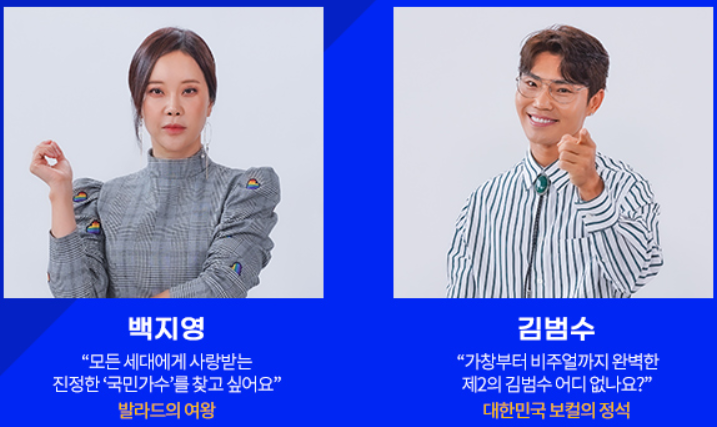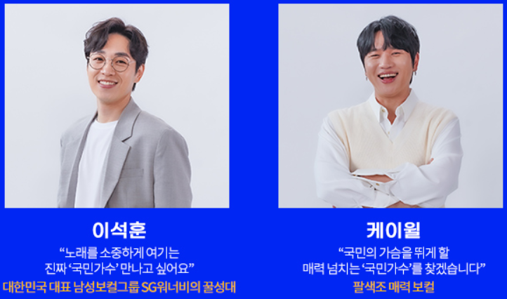 현재 김성주 아나운서가 MC를 맡고 있으며, 백지영, 김범수, 케이윌 등 실력파 가수들이 참여하여 자신들의 노하우를 전하고 있습니다. 이에 따라 내일은 국민가수에 다양한 연령층 및 인기를 얻고 있는 유명 유튜브 스타들도 참여하고 있습니다.