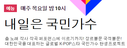 내일은 국민가수는 트롯 프로그램을 통해 트롯 광풍을 일으킨 TV조선의 제작진이 준비한 K-POP 차세대 오디션입니다. 모든 장르와 국적을 뛰어넘어 노래/춤, 착사/작곡, 퍼포먼스에 있어서 대한민국을 대표하는 글로벌 K-POP스타를 뽑는 오디션이라고 보시면됩니다.