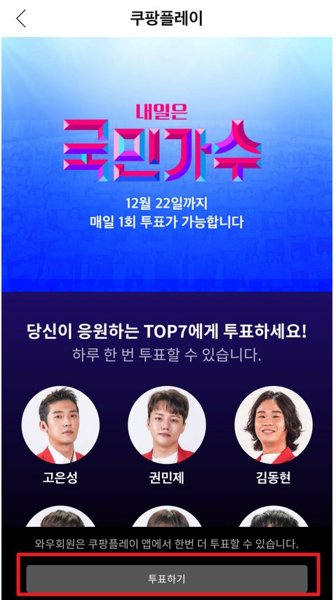 내일은 국민가수 투표방법은 아래와 같이 쿠팡 앱에 접속 -> 쿠팡플레이 선택 -> 쿠팡플레이에서 투표 배너 클릭 -> 7명을 선정 후 투표하기를 눌러주시면 됩니다.