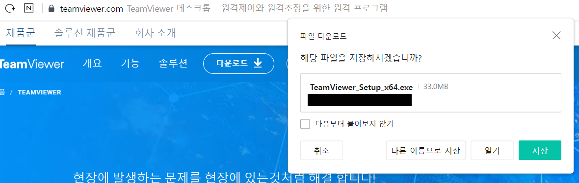 2. 위의 팀뷰어 무료 다운로드 버튼을 눌러주면 아래와 같이 실행파일이 뜨게 됩니다. 그럼 '열기'를 통해서 실행파일을 열어서 바로 실행을 해주시면 됩니다. 실행파일은 굳이 저장하실 필요까지는 없습니다. 원하시면 저장하셔도 됩니다.