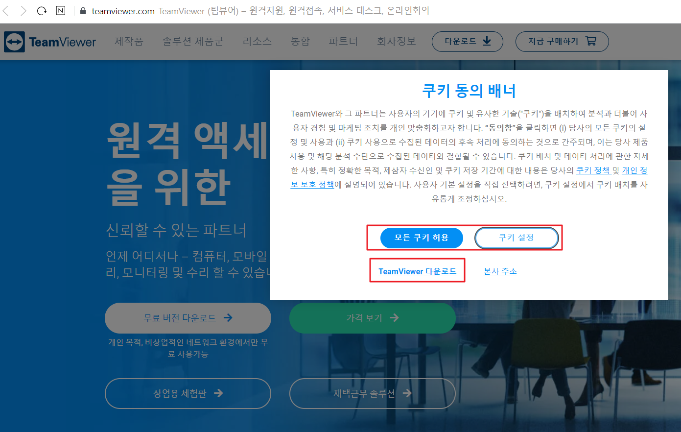1. 팀뷰어 공식홈페이지에 가시면 쿠키동의 배너가 뜹니다. 그 아래에 보시면 TeamViewer 다운로드를 통해 바로 다운로드를 실행하실 수 있습니다.