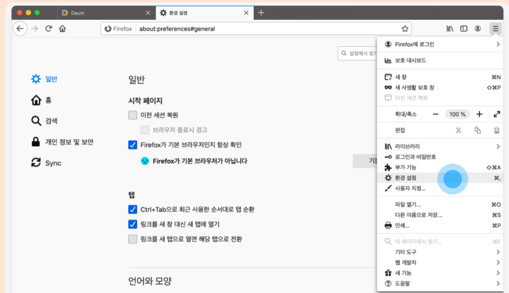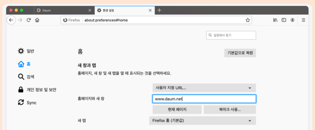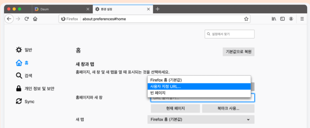 파이어폭스에서 다음을 시작페이지로 설정하기