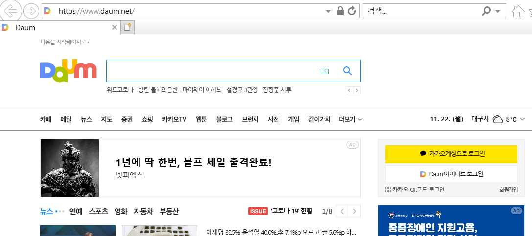 이렇게 셋팅해주신 후 인터넷 익스플로러를 다시 열어보시면, 다음으로 셋팅이 되어있는 걸 확인하실 수 있습니다.