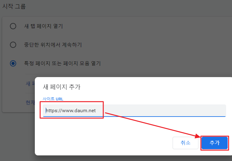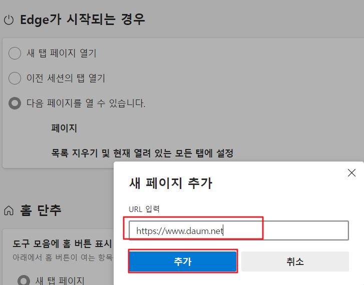 새 페이지 추가에는 https://www.daum.net를 입력한 후 '추가'를 해주시면 됩니다.