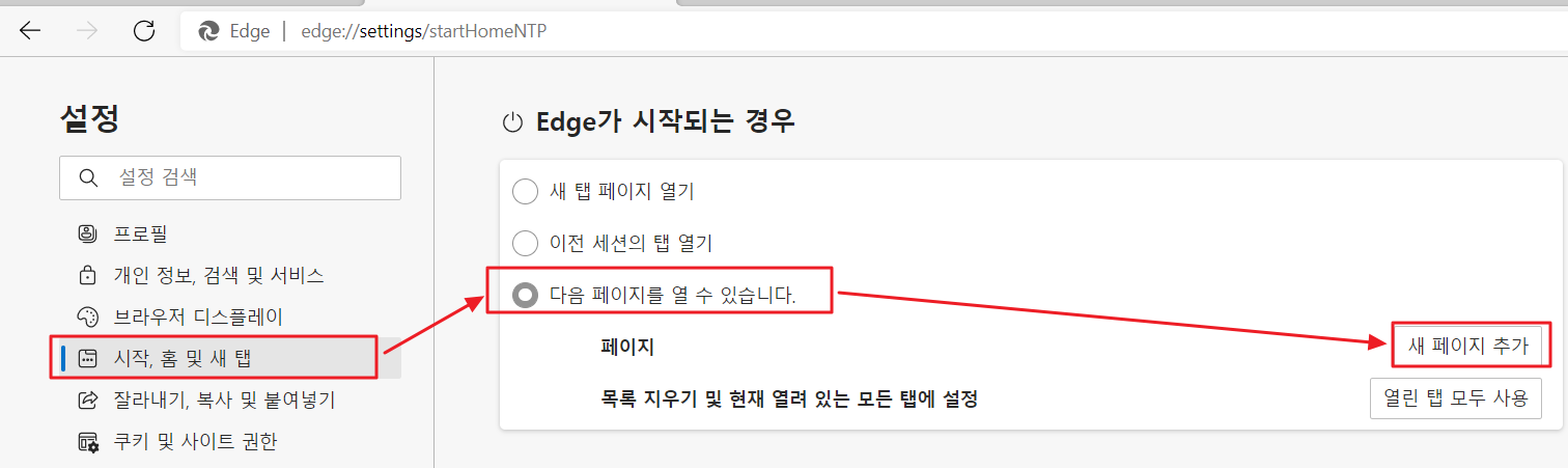 2. 시작, 홈 및 새탭 -> 다음 페이지를 열 수 있습니다. -> 새 페이지 추가를 해줍니다.