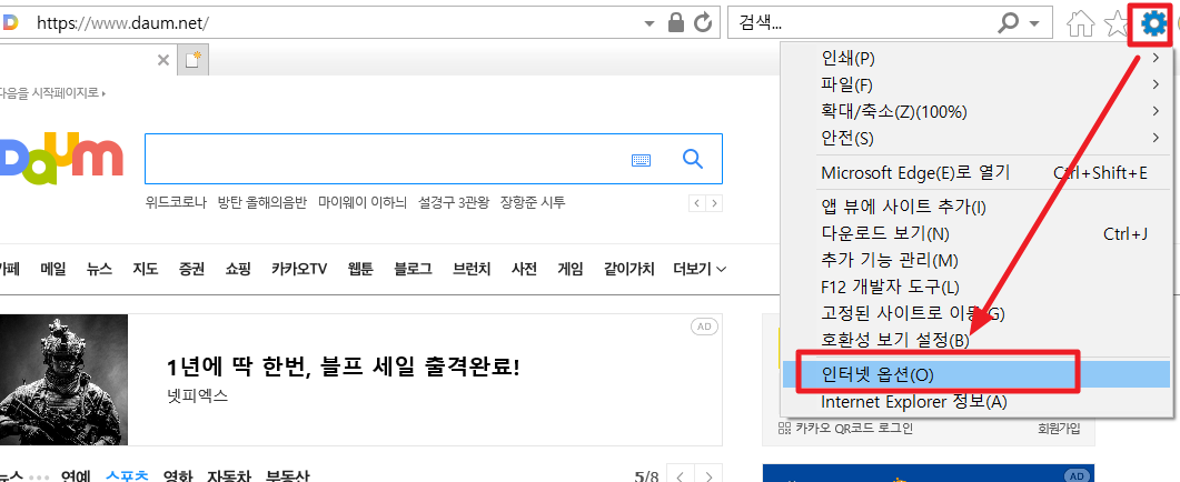 인터넷 익스플로러에서 다음을 시작페이지로 설정하기