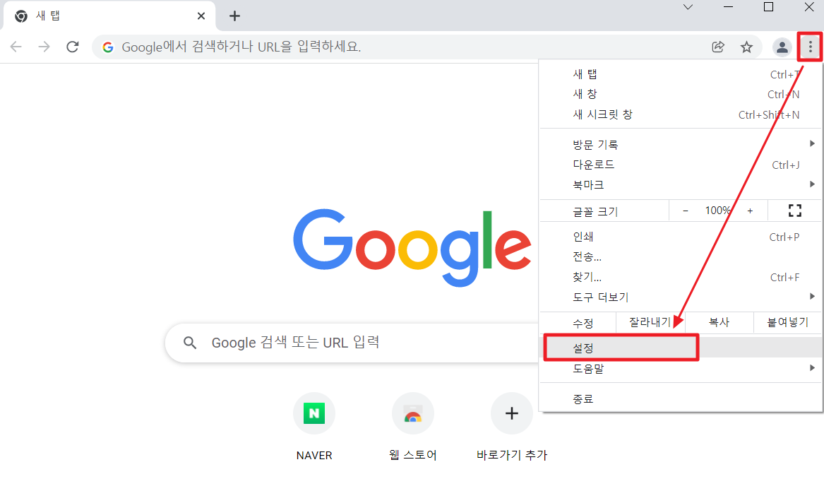 1. 크롬 브라우저에서 우측 상단 점 세개를 클릭 후 설정으로 가줍니다.