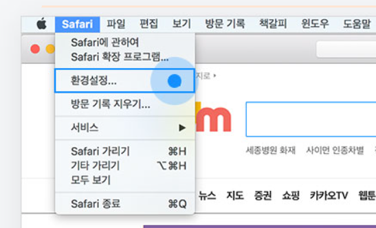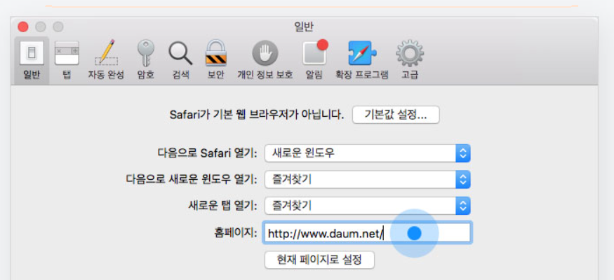 사파리 브라우저에서 좌측상단의 Safari->환경설정으로 들어갑니다. 이후, 홈페이지에 다음 주소를 아래와 같이 입력해주시면 셋팅이 완료됩니다.