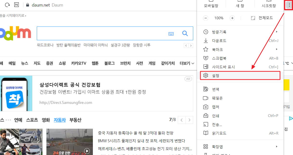 1. 우측 상단 세개의 점을 클릭 -> 설정으로 가줍니다.