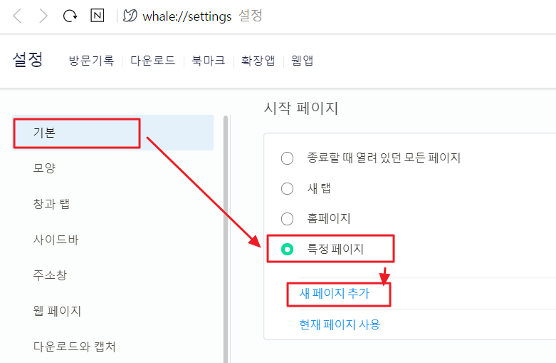 2. 기본 -> 특정페이지 -> 새페이지 추가로 들어가줍니다.