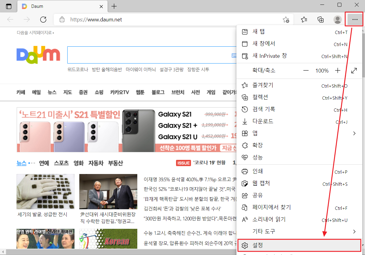 1. 엣지브라우저에서 우측 상단 점세개 클릭 후 설정으로 들어가줍니다.