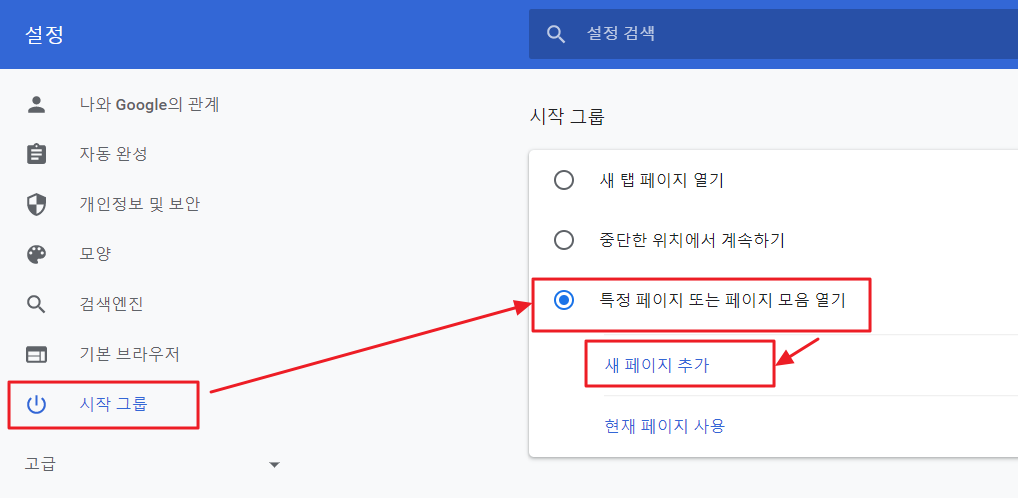 2. 시작그룹 -> 특정페이지 또는 페이지 모음 열기 -> 새 페이지 추가를 해줍니다.