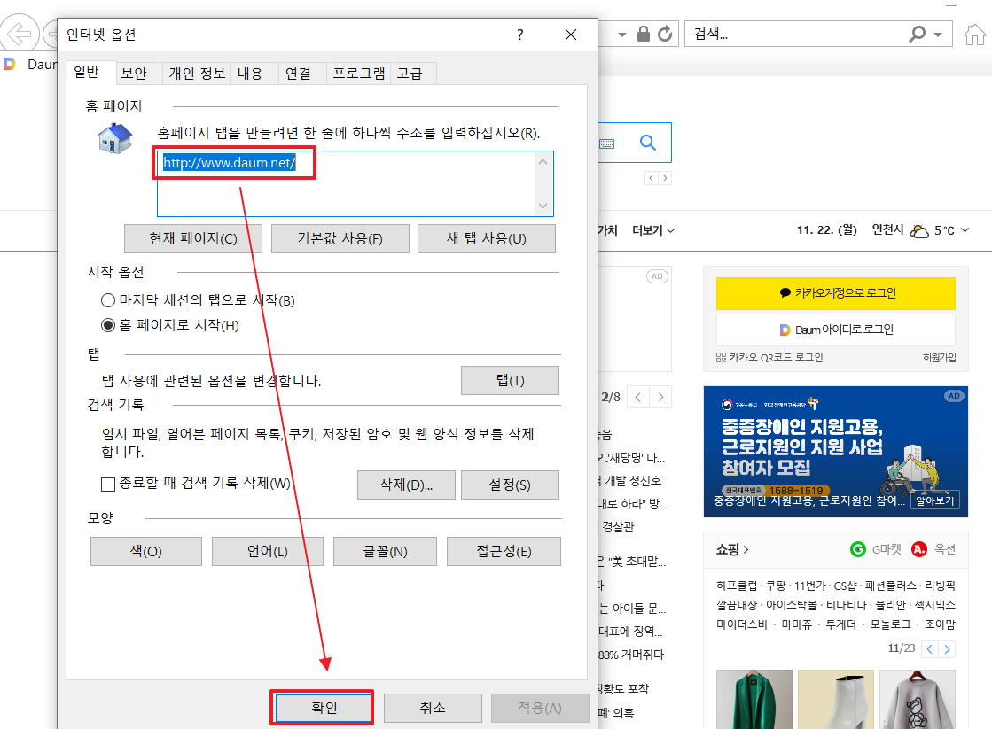 3. '일반 탭 - 홈페이지'에 https://www.daum.net를 입력해준 후 확인을 해줍니다.