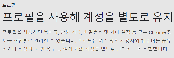 컴퓨터를 다양한 사람들이 함께 사용하는 경우도 많습니다. 하지만 크롬의 경우 프로필을 사용해서 방문 기록이나, 비밀번호 설정 등이 가능해서 개개인마다의 크롬 웹브라우저의 상태를 유지시킬 수 있습니다.