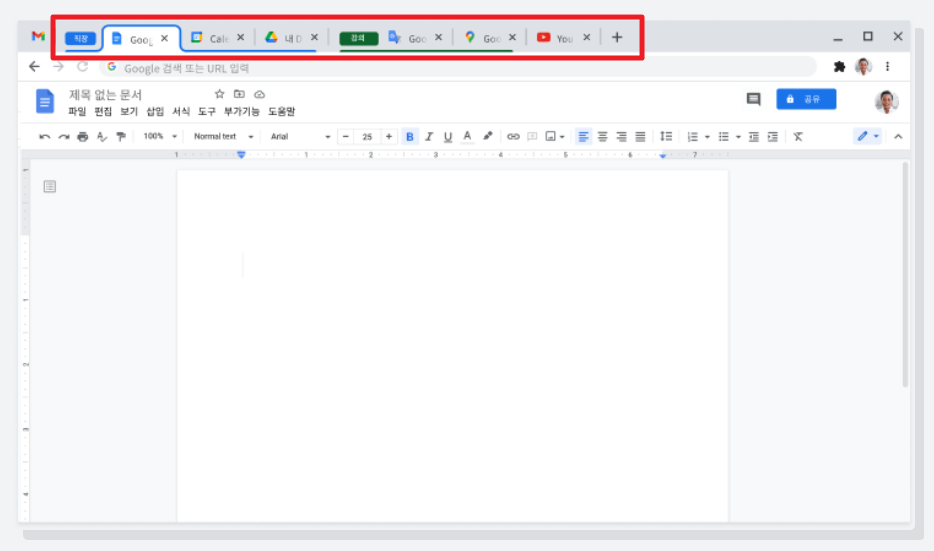 아래와 같이 여러개의 탭을 한 창을 사용하여 이용할 수 있습니다. 과거 인터넷 익스플로러 같은 경우 매번 새 창이 띄워졌는데요, 그럴 때 메모리 용량을 많이 차지하게 됩니다. 탭을 사용하게 되면, 여러가지 작업을 동시에 진행할 수 있을뿐더러, 자주 사용하는 탭의 경우 고정을 하는 등 다양한 작업을 하실 수 있습니다.