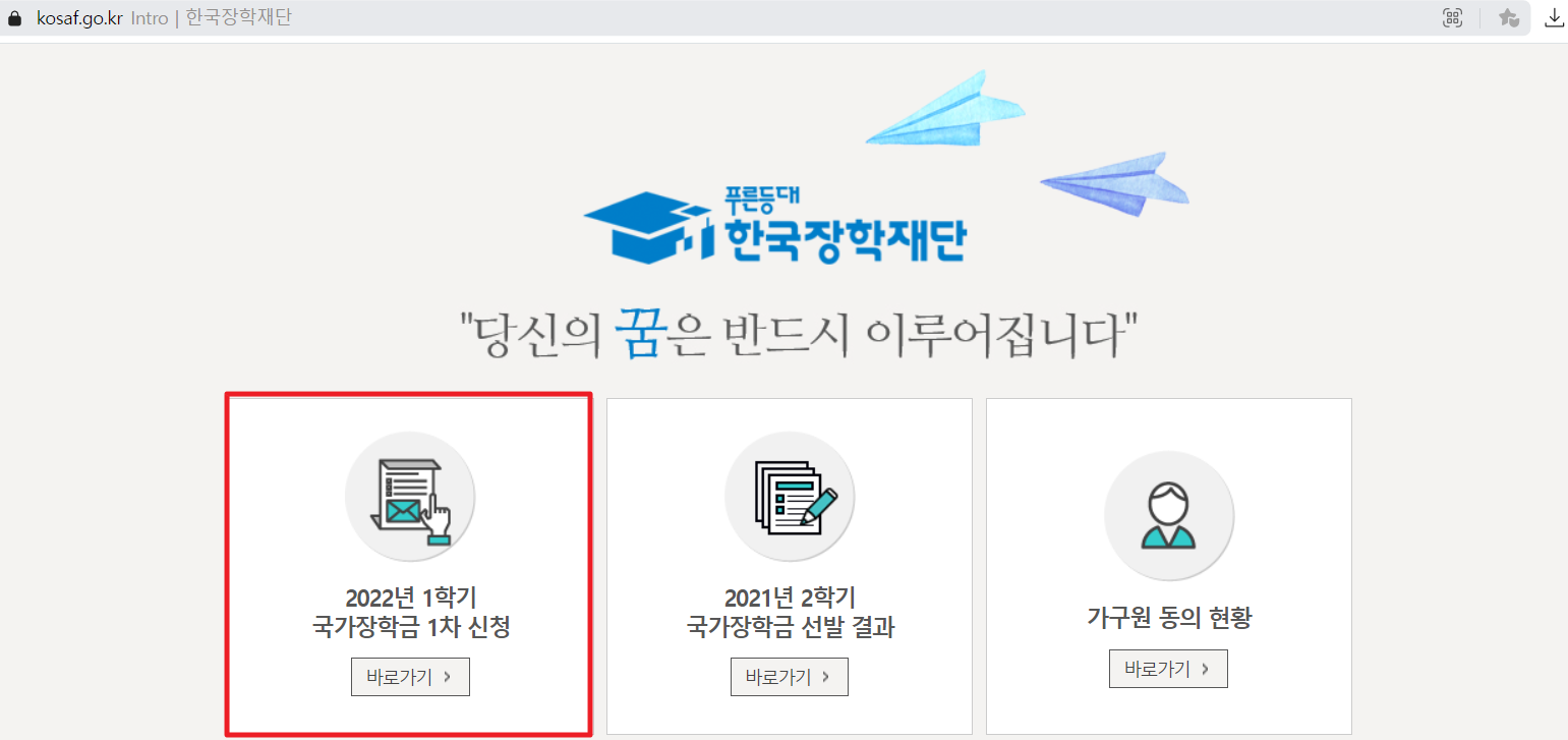 한국장학재단에 들어가시면 2022년 1학기 국가장학금 1차 신청이 있으니 여기서 신청해주시면 됩니다.