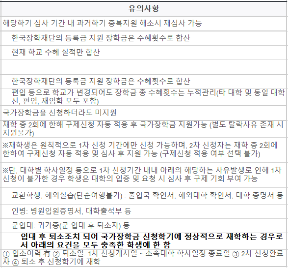 주말이나 공휴일 포함해서 신청이 가능하고, 마감일을 제외하고는 24시간 신청이 가능합니다. 또한 재학생/신입생/편입생/재입학생/복학생 등 모든 학적이 신청할 수 있지만, 재학생의 경우 원래 1차 신청 기간에만 신청할 수 있습니다. 2차 신청자의 경우는 재학 중에 2회에 한해서 구제 신청이 자동으로 적용되게 되며 심사 후에 지원을 할 수 있습니다.