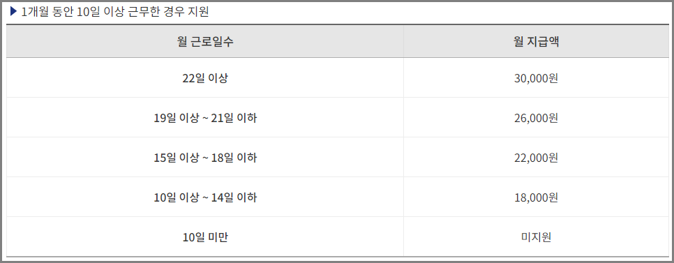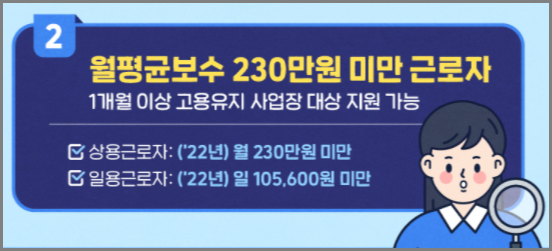 지원금 신청 이전에 1개월 이상 고용이 유지되어있어야 합니다. 일용노동자의 경우 조금 예외가 있는데 신청일 이전 1개월 동안 10일 이상 실제 근무가 있었어야 합니다. 그리고 퇴사한 노동자에 대해서는 해당 자금을 지원하지 않습니다. 또한 최저임금을 준수하고 있어야 합니다.