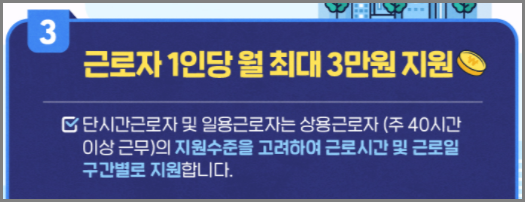 일자리 안정자금 지원금액의 경우 1인당 월 최대 3만원이 지급되게 됩니다. 이는 단시간 노동자와 일용노동자에 따라서도 금액이 달라지게 되는데요, 아래와 같은 기준으로 안정자금 지원금액이 달라지니 확인해주시면 될 것 같습니다.