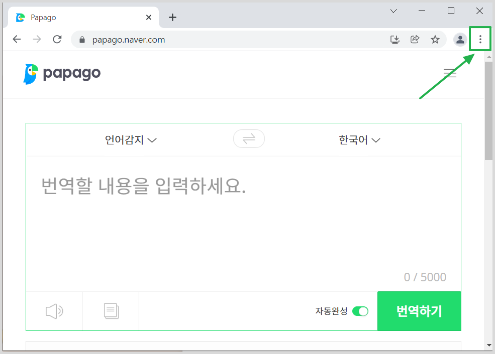 마찬가지로 크롬을 사용해서 파파고로 들어가줍니다. 그럼 오른쪽 상단에 점 세개가 보이실거에요. 점 세개 버튼을 눌러줍니다.