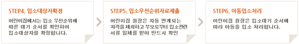 어린이집 입소 대기 신청 방법의 경우 총 여섯가지의 스텝으로 진행되게 됩니다. 먼저 부모님께서 어린이집에 입소를 원하는 아동을 등록한 후, 어린이집을 검색합니다. 그 후에, 예약 신청을 하시면 됩니다. 그럼 어린이집에서는 입소 우선순위에 기반한 대기 순서를 확인해서 입소대상자를 확정하게 됩니다. 이렇게 입소대상자 확정이 진행되게 되면 어린이집 원장은 부모님으로부터 서류를 받아 확인을 하게 되고 입소처리를 진행하게 됩니다.