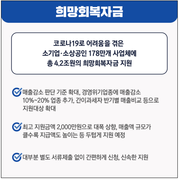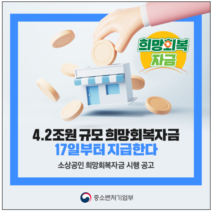 소상공인 희망회복자금은 4.2조원 규모로 지급되며, 요약한 내용은 중소벤처기업부에서 카드뉴스로 정보를 제공하고 있습니다. 아래의 소상공인 희망회복자금 내용을 확인해주세요.
