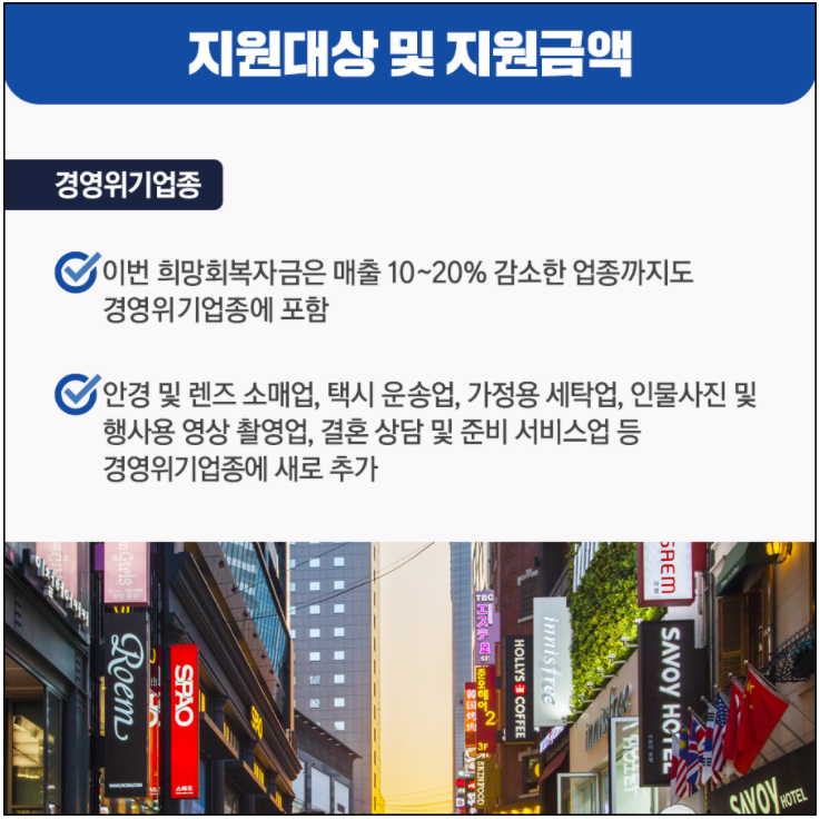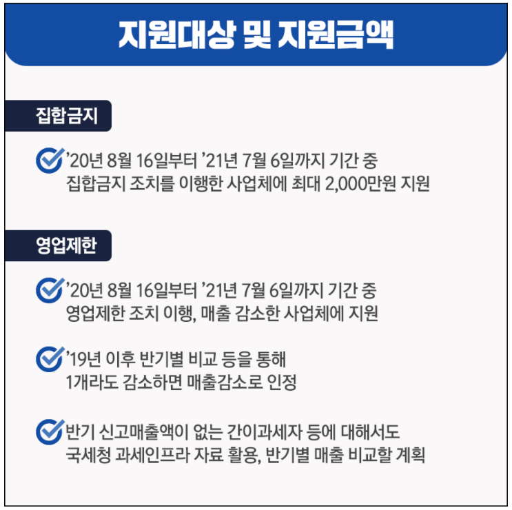 - 20년 8월 16일 ~ 21년 7월 6일 동안 집합금지·영업제한 1회 조치를 받거나 경영위기업종에 해당하는 소기업 및 소상공인