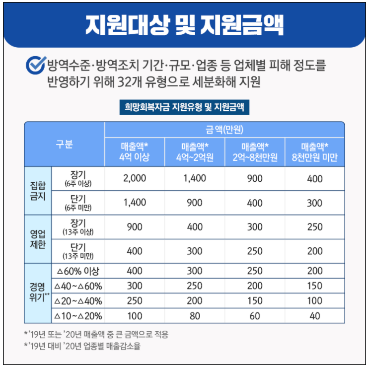 소상공인 희망회복자금 지급은 집합금지/영업제한/경영위기의 3가지 유형에 따라 지급 규모가 달라집니다.