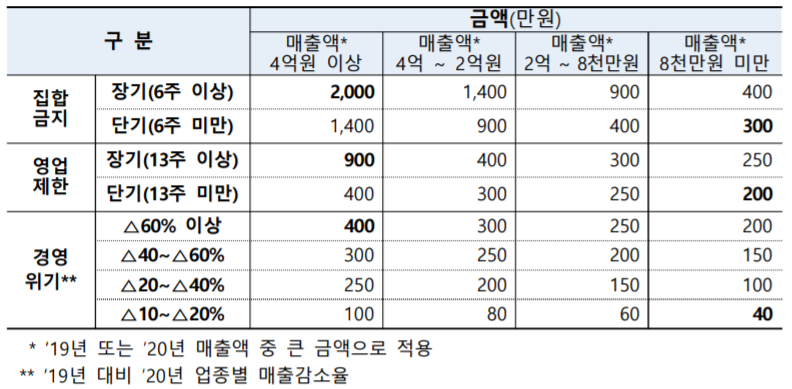 -경영위기 : 19년 대비 20년 매출액이 10% 이상 감소한 업종에 속하며 개별 사업체 매출도 감소한 경우