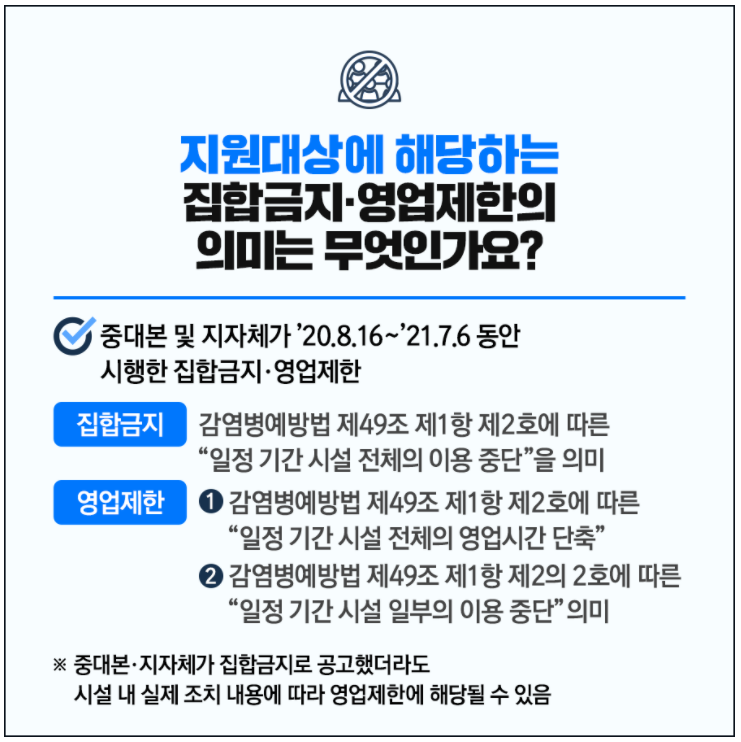 - 집합금지 : 중대본 방역조치를 이행한 사업체