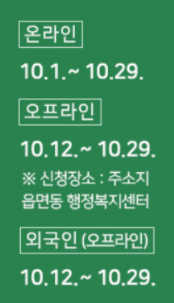 경기도 재난기본소득의 신청 일정은 온라인의 경우 10월 1일부터, 오프라인(현장신청)의 경우 10월 12일부터 가능하게 됩니다. 더 자세한 사항은 아래 신청 방법에서 말씀드리겠습니다.