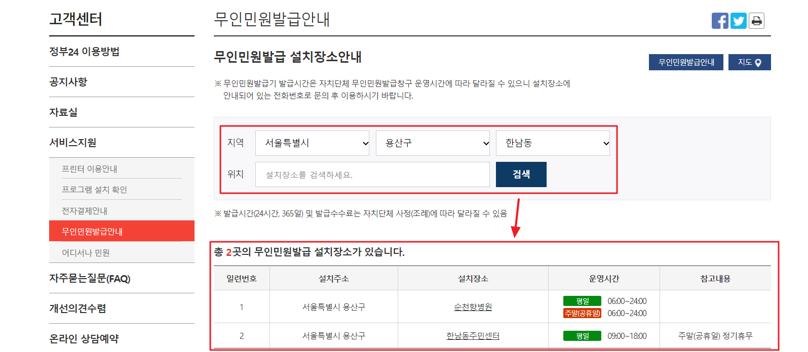 주민등록초본 무인발급기를 통한 발급방법은 가까운 무인발급기를 확인하여 방문하는 방법입니다. 무인발급기를 통한 주민등록초본 발급 수수료는 1통에 200원입니다. 무인발급기는 주민센터 등에 설치가 되어있는데요, 꼭 주민센터가 아니더라도 지하철역 등 사람들이 많이 사용하는 장소에 무인발급기가 설치되어있으니, 무인발급기 위치를 확인하시어 방문해주시면 됩니다. 무인발급기 위치 확인은 정부24 공식 홈페이지에서 아래와 같이 원하시는 지역을 넣고 검색해주시면 됩니다.