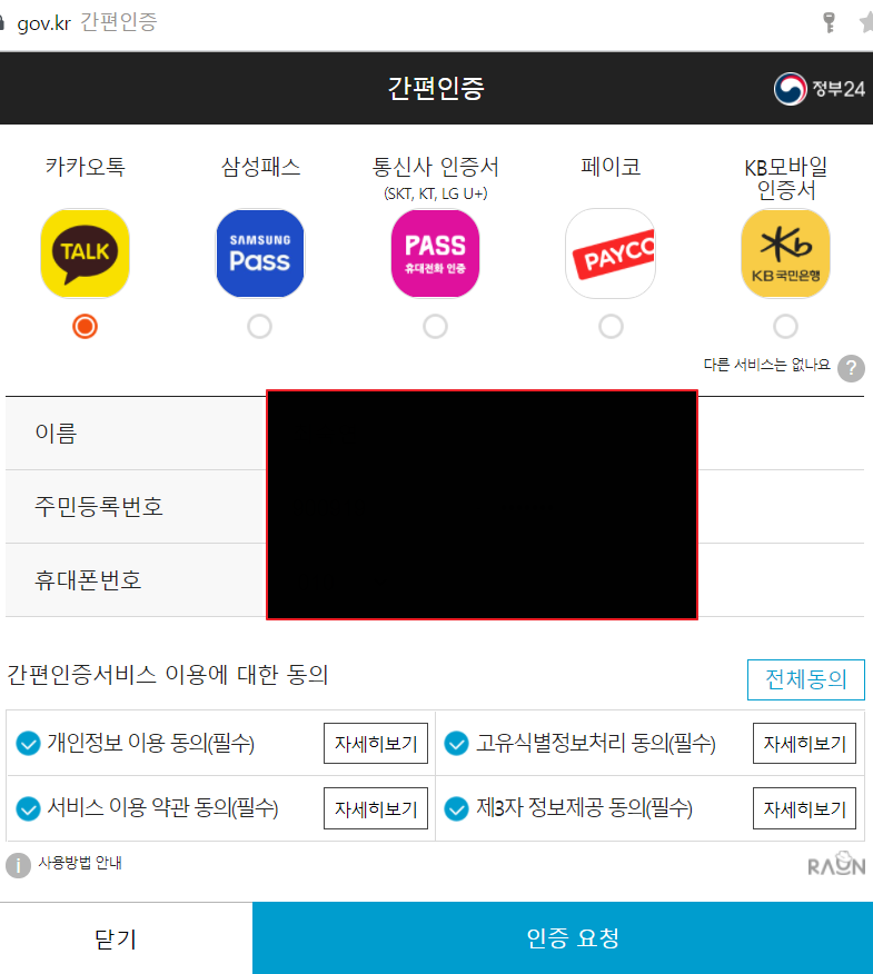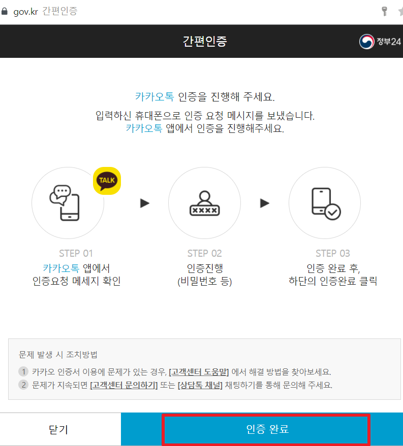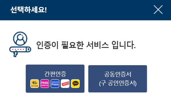 6. 간편인증 혹은 공동인증서를 통해 인증을 진행해주세요. 저는 간편인증으로 진행했습니다. 인증을 완료하신 후, '인증완료'버튼을 눌러주세요.