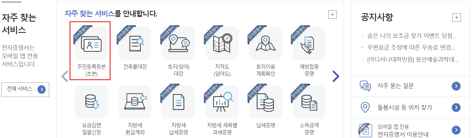 1. 정부24 접속 후, 자주찾는 서비스-주민등록등본(초본) 버튼으로 들어가줍니다.