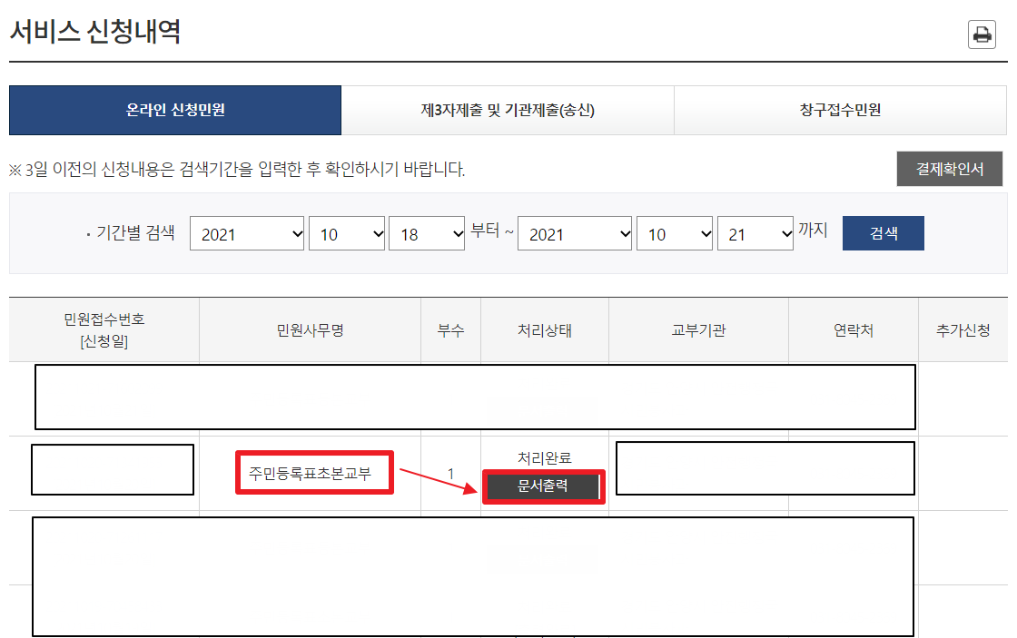 7. 위의 step까지 완료하면, 아래와 같이 서비스 신청내역에 주민등록초본 교부 - 문서출력을 눌러서 프린트해주시면 됩니다.