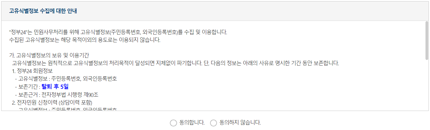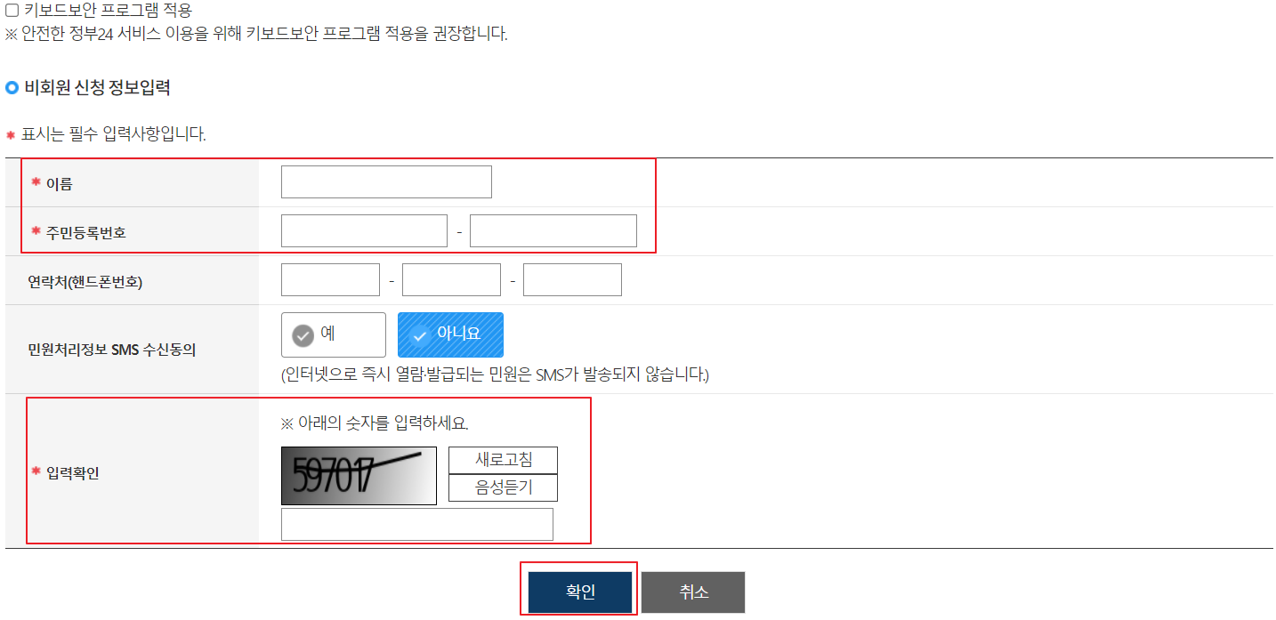 4. 개인정보 수집 및 고유식별정보 수집 이용동의에 '동의합니다'를 체크하고, 비회원 신청 정보입력에 *로 되어있는 부분만 입력을 해준 후, 확인을 눌러줍니다.