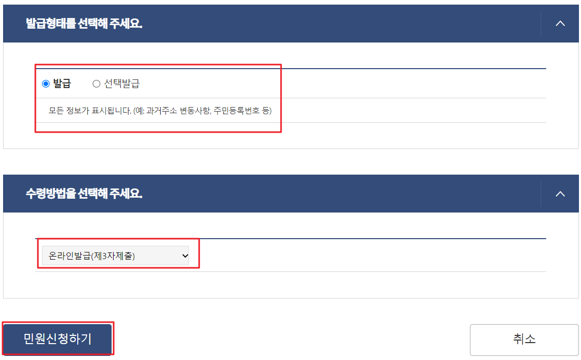 발급형태에서 '선택발급'을 체크하게 되시면, '과거의 주소변동 사항', '개인인적사항 변동 내용', '주민등록번호 뒷자리, 국내거소신고번호, 외국인등록번호', '병역사항', '세대주 성명과 세대주와의 관계'를 포함시킬 것인지 제외할 것인지를 선택하실 수 있습니다. 그냥 '발급'을 체크하시게 되면 기본 Form으로 발급이 됩니다.